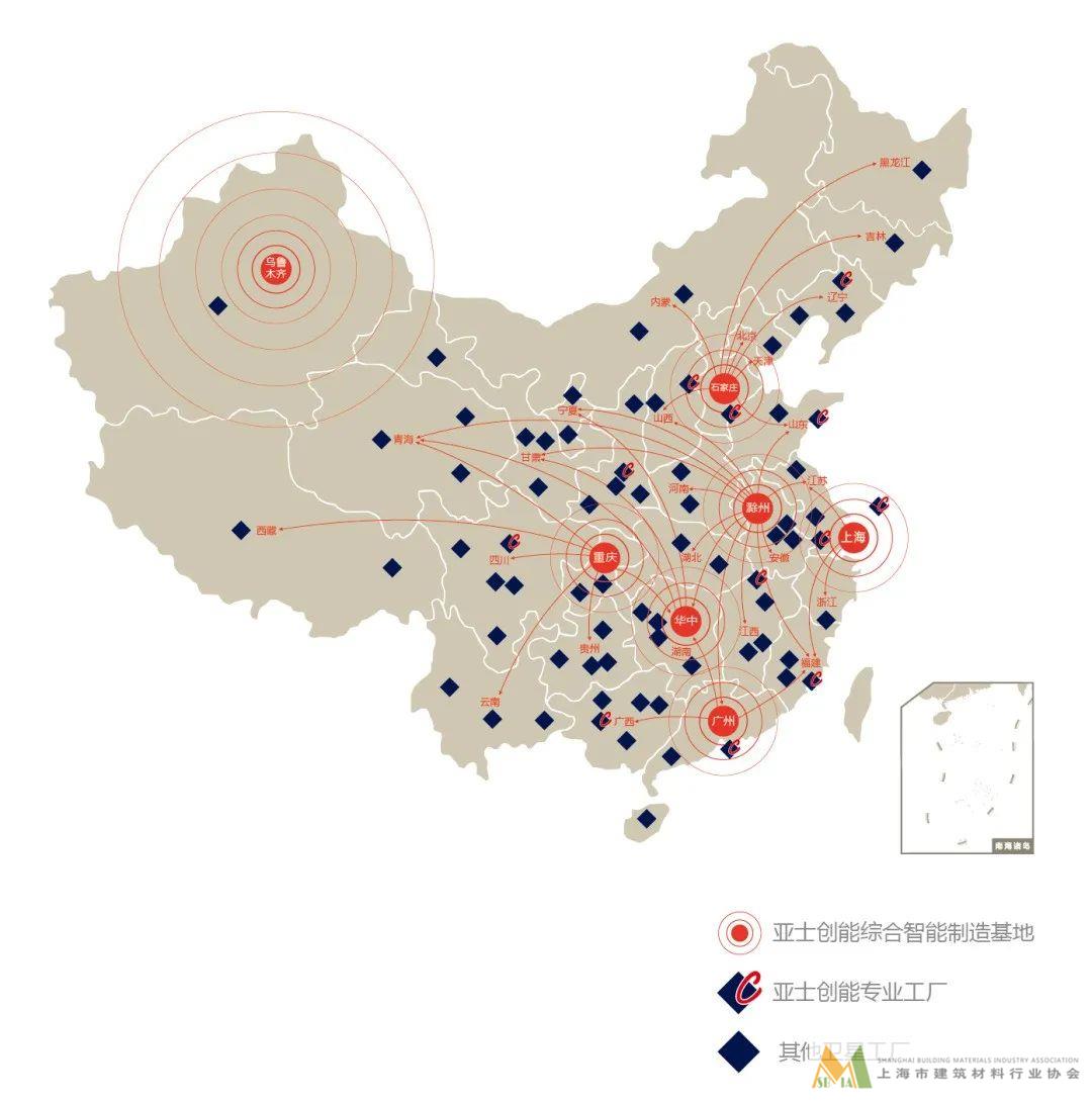 集團在全國構建起“1+6+N”三個層級的產能供應保障體系。第一層級指1個上海總部、1個上海工廠加6大制造基地;第二層級指12個專業工廠;第三層級指亞士生態圈中的全國數十個其他衛星工廠。三個層級的全國產能布局,形成涂料、成品板500公里,保溫板300公里,干粉砂漿200公里的就地就近立體化供應鏈。